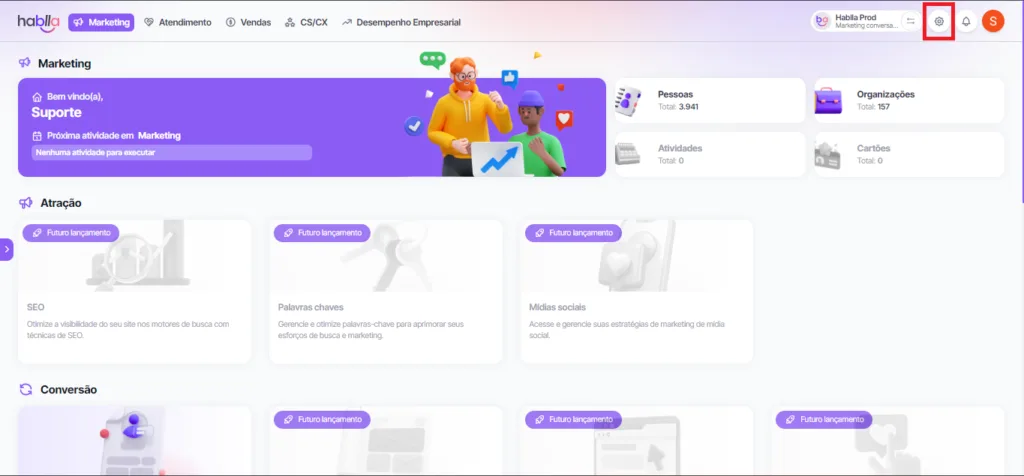 1\. Une fois connecté à votre compte, accédez à [**Studio**](https://studio.hablla.com/workspace/643d802021b6aa9234eb9797/marketing?fbp=fb.1.1753742035820.5658395625\&sck=730218fd-da2e-40d1-b6a8-b13deea06044\&external_id=730218fd-da2e-40d1-b6a8-b13deea06044). Dans le coin supérieur droit de l'écran, à côté de l'initiale de votre nom, vous trouverez l'icône de **Paramètres** (engrenage). Cliquez dessus pour ouvrir le menu des paramètres.\ <br>