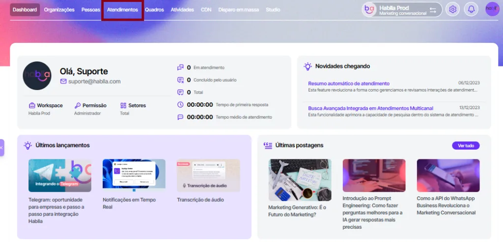 1\. Une fois connecté à votre compte, accédez à [**Studio**](https://studio.hablla.com/workspace/643d802021b6aa9234eb9797/marketing?fbp=fb.1.1750773282927.8266088573585080\&sck=53bcba93-220f-42e0-98d6-4c25c5e985db\&external_id=53bcba93-220f-42e0-98d6-4c25c5e985db). Dans le coin supérieur droit de l'écran, à côté de l'initiale de votre nom, vous trouverez l'icône de **Paramètres** (engrenage). Cliquez dessus pour ouvrir le menu des paramètres.