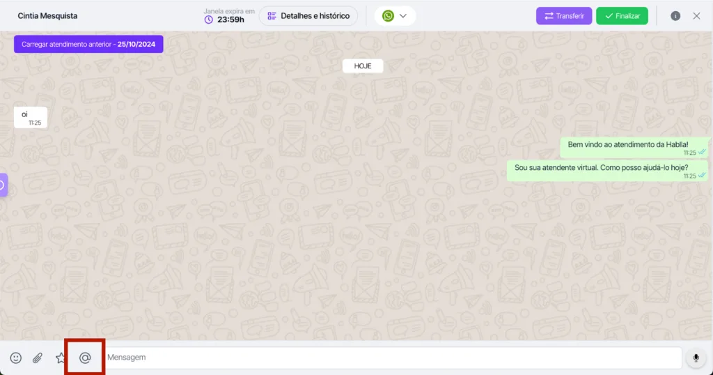 7\. Dans la fenêtre de support, cliquez sur l'icône **@** dans la zone de messages (comme le montre l'image ci-dessous). Cette icône vous permet de choisir parmi les réponses rapides enregistrées pour accélérer vos interactions avec les clients !