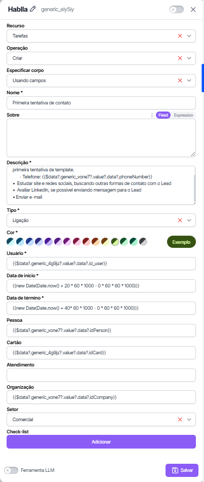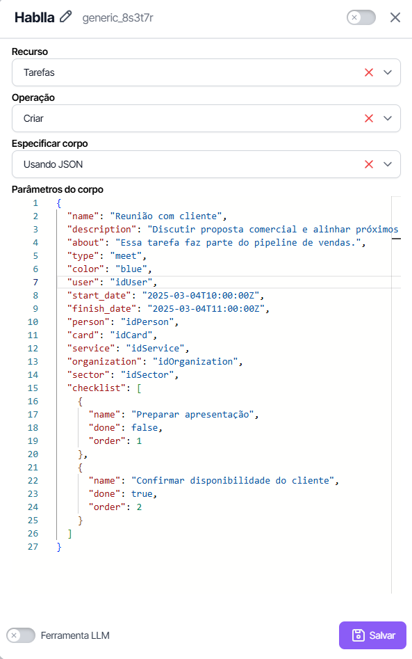 The operation **Create Task** in Hablla Studio allows you to organize and automate the management of activities within the system. You can choose between configuring the fields manually or using a **JSON** custom for greater flexibility.
