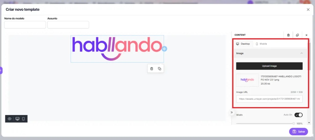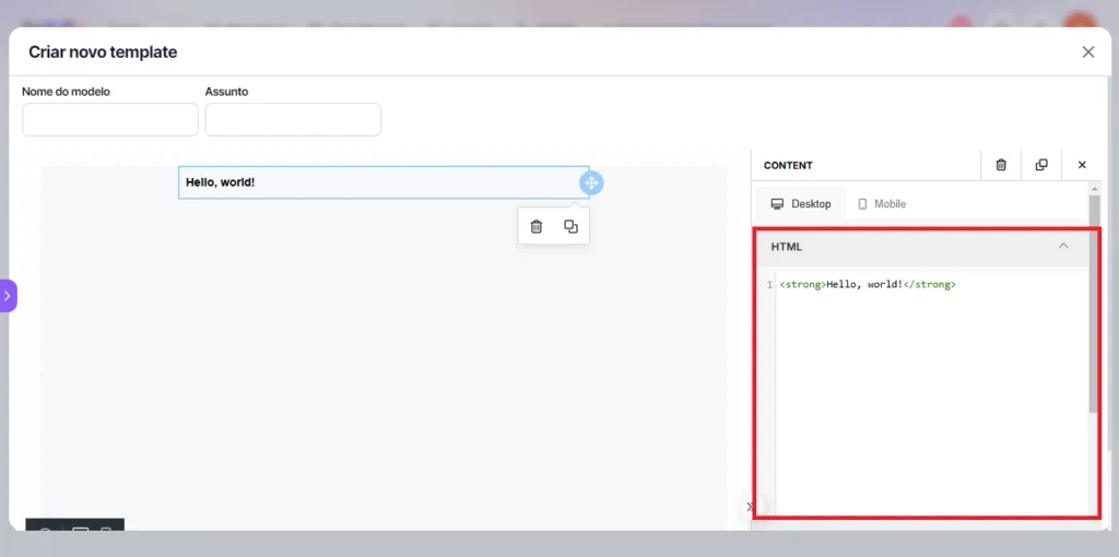 2. After adding the HTML element to the template, go to the right side tab to make adjustments. In this section, you can insert any code you want, adapting the design with the HTML custom content.