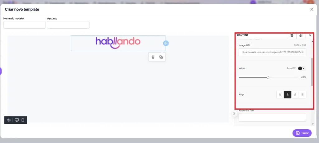 2. Once added, you can configure the image in the tab located on the right side. In Image you can upload the image, add the image link, set its size, alignment and alternative text.