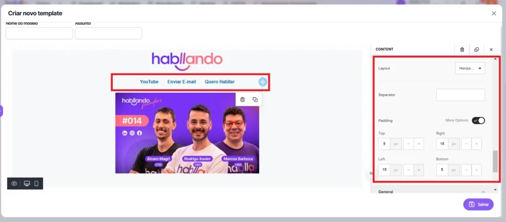 In the side Menu Body you can configure the entire body of the template. By accessing the submenu General, you can set the text and background color, the size and alignment of containers, as well as customize the font and text size for the whole email structure.
