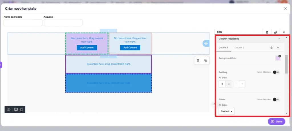 2. To configure the columns after adding them, go to the right side tab and select Columns. In this section, you can adjust the column split as you wish, customizing your template's layout.