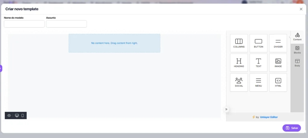 7. You will be directed to the email template creation screen, where you will find fields such as Template Name and Subject. Fill in these fields to start your template.