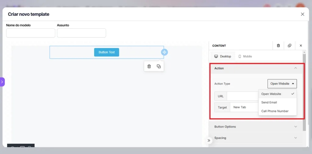 2. When you add the button, configure it in the right side tab. In Action, define the action the button should perform and the necessary details. For example, if the action is Open Website, just insert the desired website link.