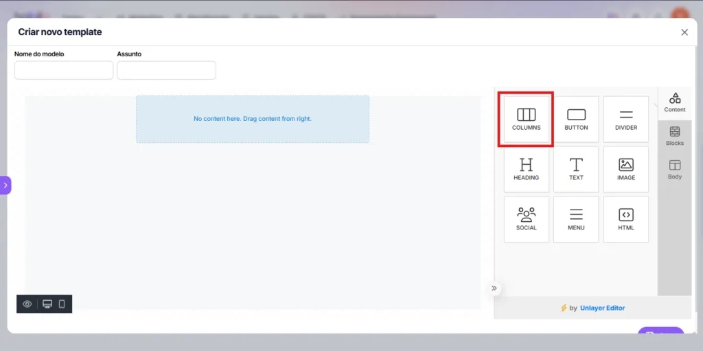 1. To add columns, click the columns element and drag it to the desired location in the template.