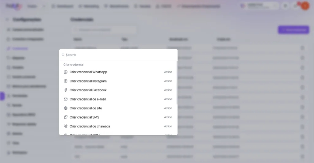 4. Selecione o tipo de credencial que deseja criar, com base no serviço que você deseja integrar, como e-mail, WhatsApp, site, entre outros.