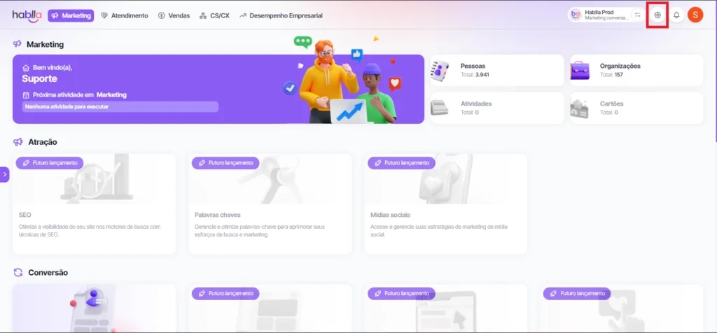 1. Já conectado em sua conta, acesse o Studio. No canto superior direito da tela, ao lado da inicial do seu nome, você encontrará o ícone de Configurações (engrenagem). Clique nele para abrir o menu de configurações.