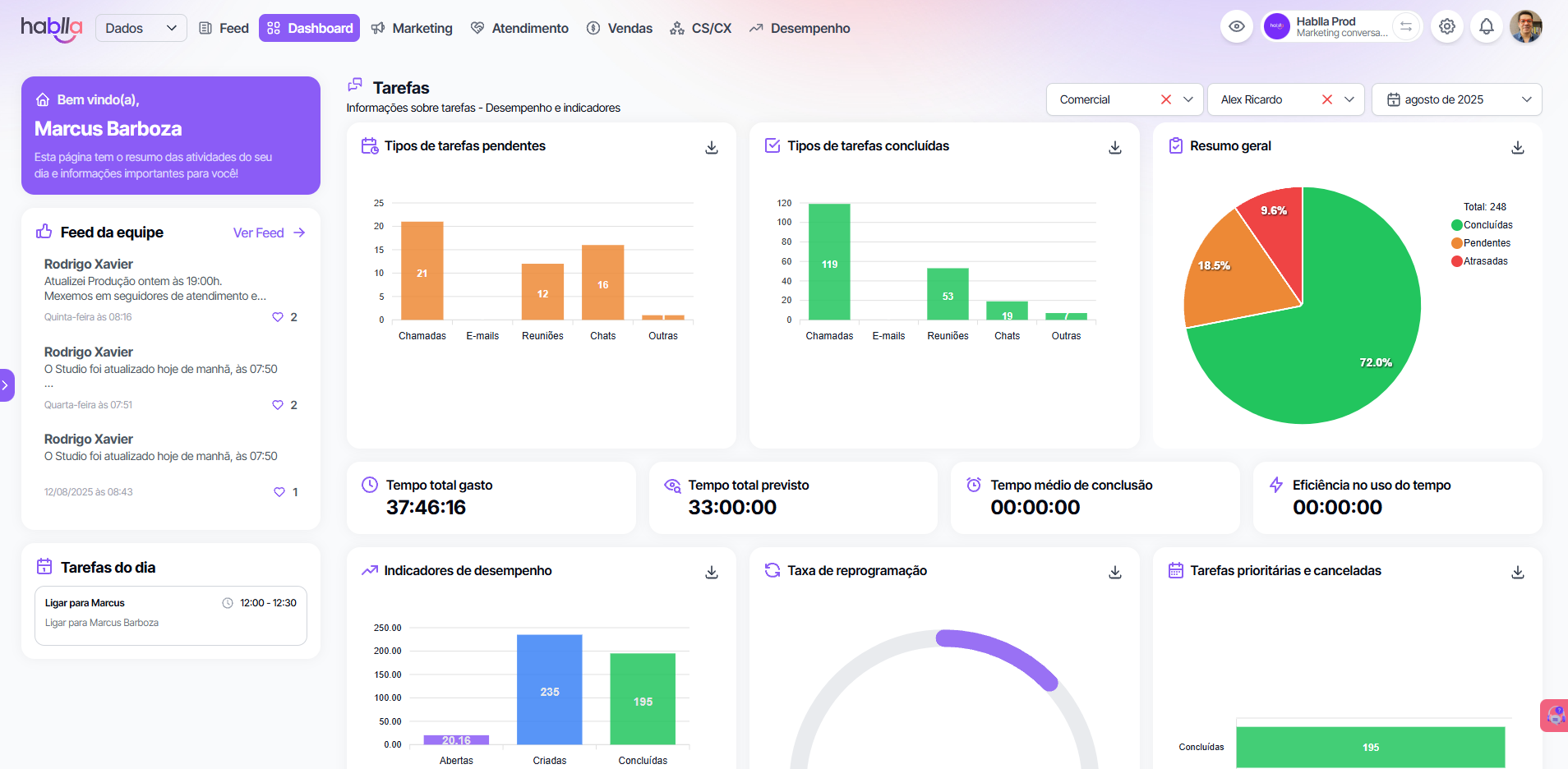 * **Tipos de tarefas pendentes e concluídas**: organiza por chamadas, e-mails, reuniões, chats ou outras categorias.